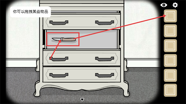 3、按提示【你可以拖拽某些物品】,从抽屉中拖拽获取【小刀】道具,将其存入右侧道具栏,用于后续解谜操作。