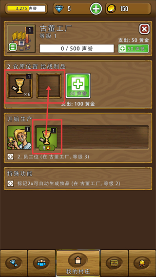 3、在【古董工厂-等级1】界面,消耗资源操作【开始生产】,可填充仓库获取战利品。
