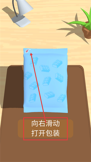1、对积木包装执行【向右滑动打开包装】操作,解锁包装内的积木组件以推进搭建。