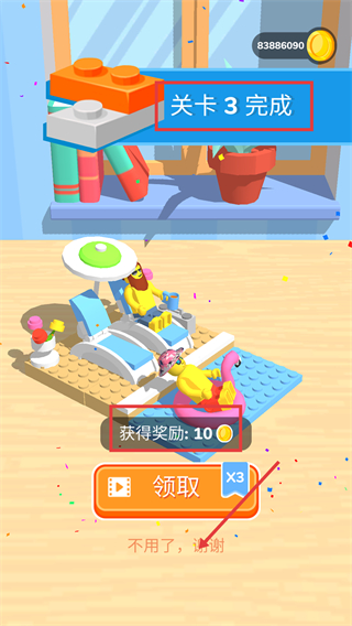 4、【关卡3完成】后,可领取【获得奖励:10-金币】,选择领取方式即可获取对应奖励。