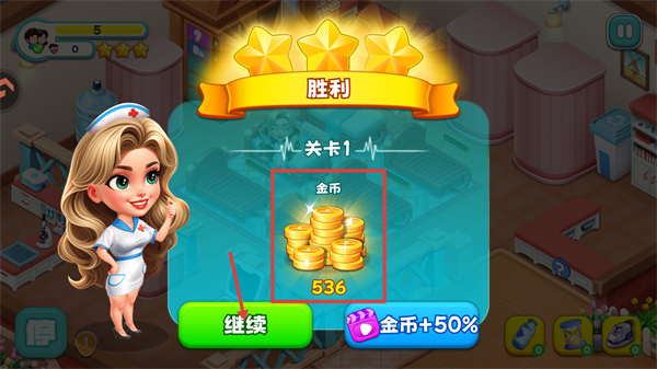3、将医疗道具拖放至对应患者处,完成诊疗操作,提升关卡评分进度以获取更高星级。