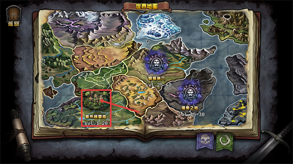 1、在【世界地图】中,新手优先选择【哥布林营地-Lv1-20】区域探索,该区域等级适配初期角色,避免挑战高等级的【蜘蛛巢穴-Lv25-40】。