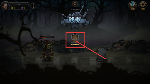 4、战斗出现【战败】提示后,点击界面中的【返回营地】按钮,回到营地休整恢复状态,调整策略后再重新挑战对应区域。