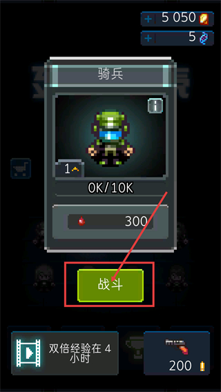 1、选择【骑兵】角色后,点击【战斗】按钮进入关卡,同时可利用【双倍经验】buff提升战斗收益效率。