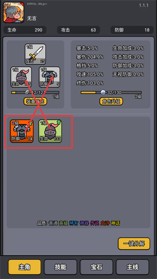 1、在装备界面中,选择【2级-防御-14】装备与【1级-生命-133】装备进行更换,可提升角色的防御与生命属性,增强生存能力。