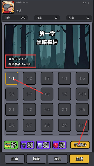 2、【第一章-黑暗森林】的【1-1】关卡,可掉落【1~5级】装备,点击【开始挑战】进入该关卡,获取初期养成资源。