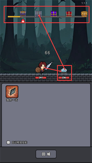 3、关卡战斗中,击败敌人可积累进度解锁上方宝箱,同时留意敌方【236-血量】,合理释放技能(如致命一击)提升输出。