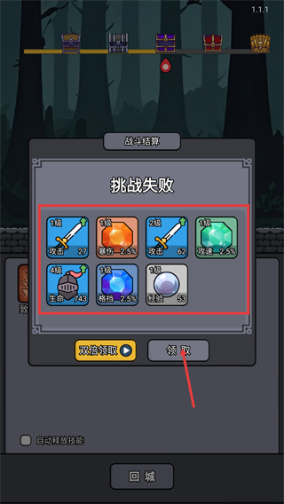 4、挑战失败后,点击【领取】可获得奖励道具,包括【1级-攻击-27】装备、【经验-53】等资源,用于后续角色养成。