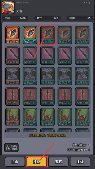 1、进入【技能】界面,可查看多系列技能(如致命、突刺等),优先解锁高阶技能(如致命三阶),能提升输出类属性。