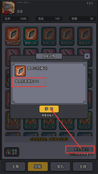 2、点击【致命三阶(被动)】后,消耗【1-剩余技能点】学习该技能,可获得【致命伤害增加30%】的增益效果。