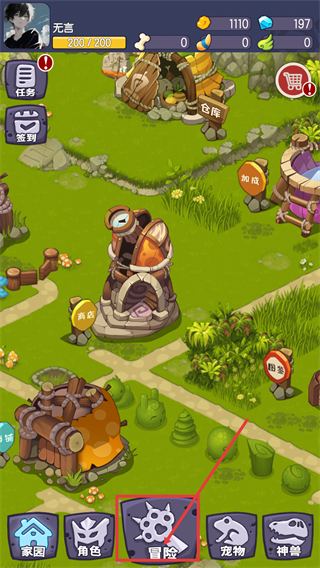1、进入界面后,可先点击底部的【冒险】按钮,开启探索流程,同时留意【任务】【签到】等功能获取资源。