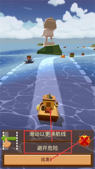 2、进入航行界面后,按照提示【滑动以更换航线】,调整路径来【避开危险】,确认后点击【出发】开始航行。