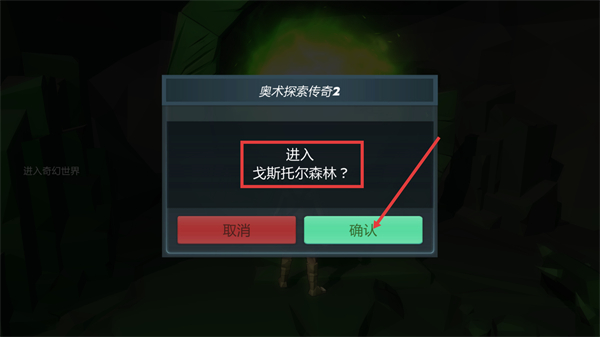 1、在【奥术探索传奇2】的弹窗中,点击【确认】按钮即可进入【戈斯托尔森林】,推进冒险流程。