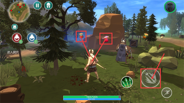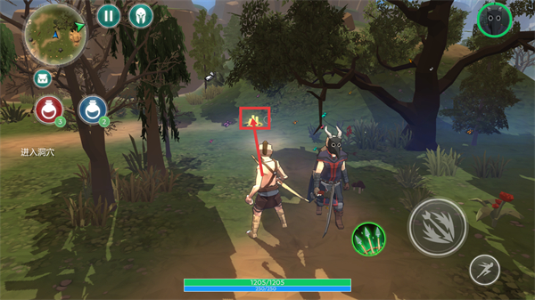 2、处于【戈斯托尔森林】场景时,用右侧攻击按钮攻击目标怪物,同时可借助左侧道具恢复状态,完成【进入洞穴】前的战斗。