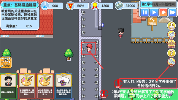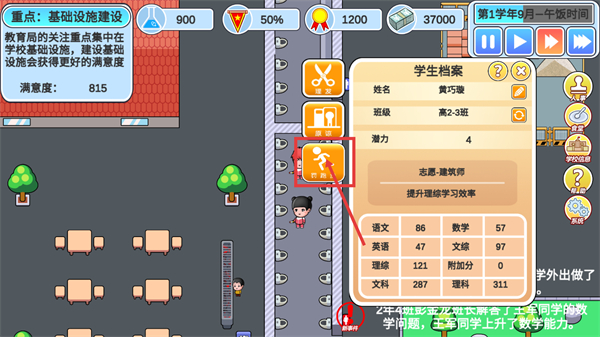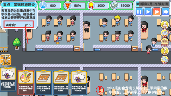 1、在【重点:基础设施建设】阶段,可使用【发展特长】类道具提升教师或学生能力,同时关注【满意度-815】的变化。