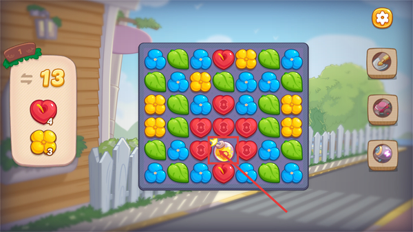2、关卡内需达成【红心-4】和【黄花-10】的消除目标,优先连接同色元素,集中消除目标图案以推进当前关卡进度。