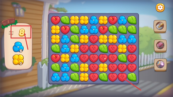 2、当前关卡剩余【8-步数】,需完成【蓝色花-6】和【黄色花-5】的消除,优先连接同色元素,同时消除【红色钻石】推进进度。