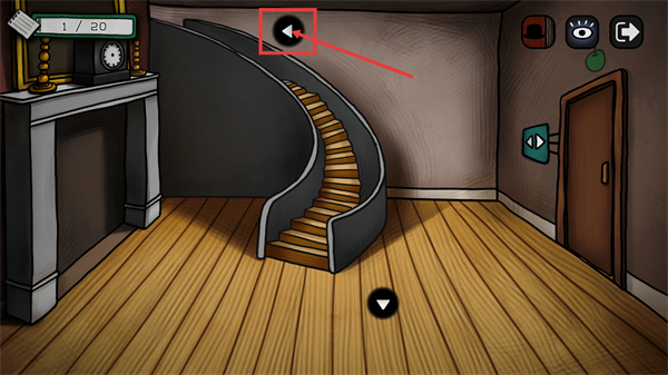 2、当前探索进度【1/20】,利用界面的箭头按钮控制移动,探索包含楼梯-壁炉的场景,推进游戏的探索流程。