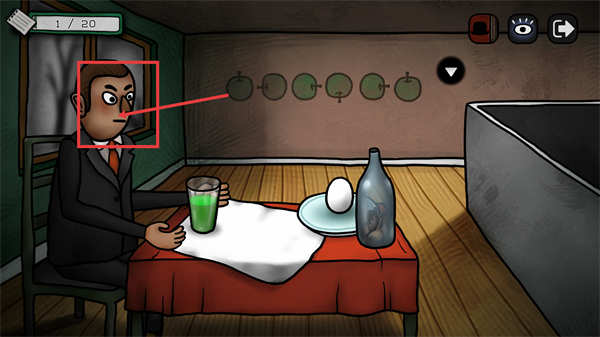 3、观察角色视线所指的墙面装饰区域,同时留意桌上的绿色饮品-鸡蛋等物品,寻找可交互的解谜线索。