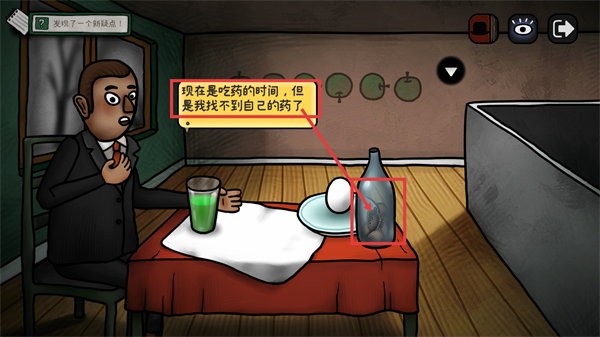 4、根据角色的话语提示,查看桌上瓶子内的药,触发【发现了一个新疑点!】的提示,推进当前解谜环节。
