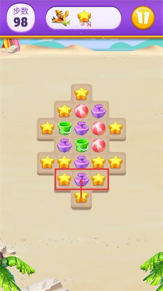 2、当前【步数-98】,关卡内有星星-沙滩球-陀螺-水桶等元素,优先消除红色框内的紫色陀螺与星星,推进关卡进度。