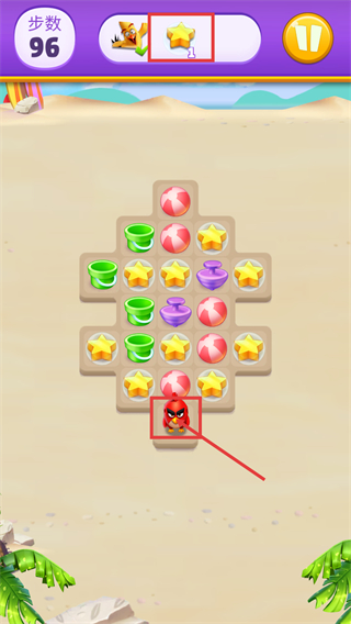 3、【步数-96】时已收集【星星-1】,消除操作后触发红色小鸟,借助其效果可更高效地完成剩余消除目标。