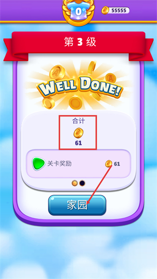 4、【第3级】通关后显示【WELLDONE!】,获得【合计-61-金币】的奖励,点击【家园】按钮可返回主界面准备下一关。