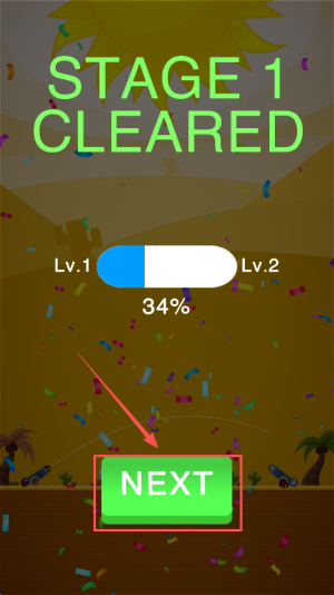 4、完成关卡:看到“STAGE1 CLEARED 34%”后点击“NEXT”,继续挑战下一关。