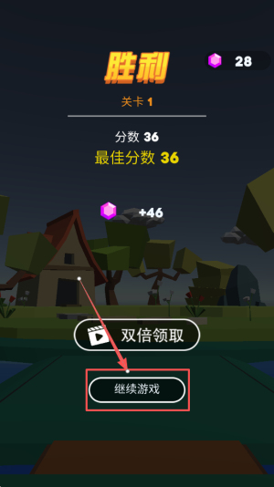 4、领取奖励:出现“胜利”界面,点击“继续游戏”收取36分与+46金币,挑战下一关。