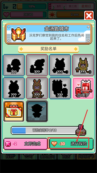 1、进入【金汤匙城市】,可选【立即完成】-耗2或【进行探险】-耗30推进,还有奖励名单可解锁。