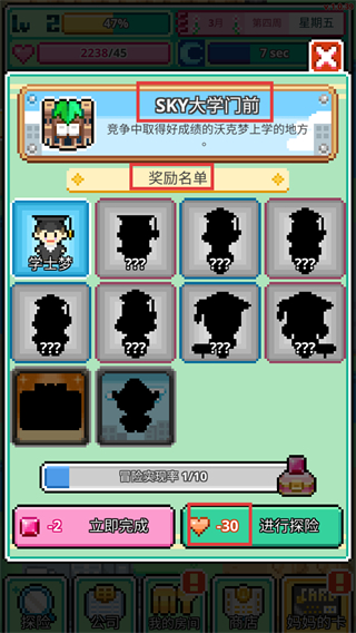 2、【SKY大学门前】是竞争中取得好成绩的沃克梦上学处,奖励名单含【学士梦】,冒险实现率【1/10】,可选【进行探险】-耗30推进。