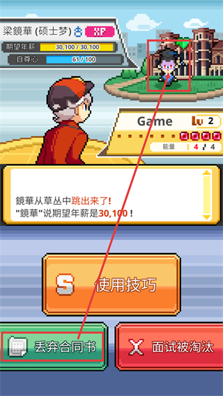 3、遇到【梁镜华(硕士梦)】,其【期望年薪】为【30,100/30,100】、【自尊心】【61/100】,对方跳出后可选【使用技巧】等互动选项。