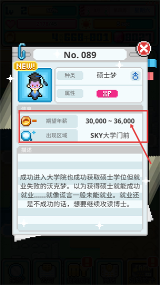 4、【No.089】是【硕士梦】,期望年薪【30,000~36,000】,出现区域是【SKY大学门前】,是就业失败后想读博的沃克梦。