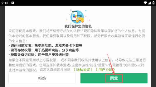 1、同意隐私政策:启动游戏后,阅读隐私政策,点击“同意”按钮以接受条款并继续。