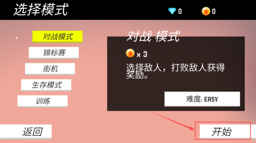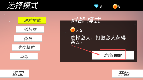 3、设置难度:在对战模式界面,选择难度等级,点击“开始”按钮进入角色选择。