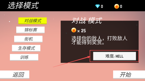 2、选择模式:在主菜单中,选择“对战模式”并设置难度,点击“开始”进入战斗。