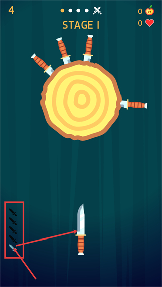 2、进入【STAGE-1】后,瞄准旋转的木轮,点击待投掷的刀具将其插入木轮,注意避开已有的刀具位置。
