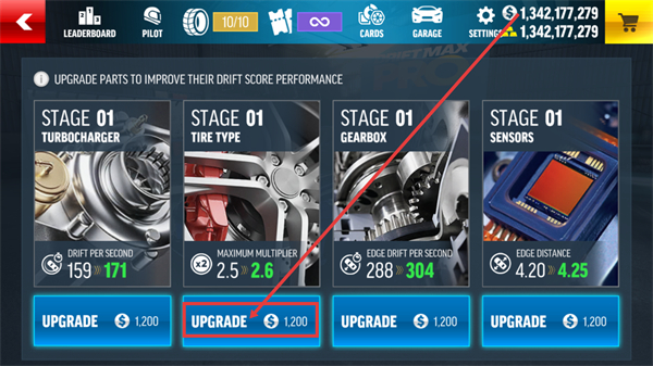 2、在升级界面选择【STAGE-01】类部件,点击对应【UPGRADE】按钮,花费1200金币提升部件的性能属性。