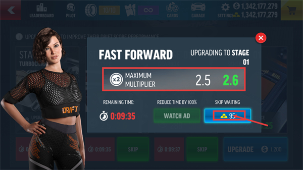 4、在【FAST-FORWARD】界面,消耗95金币点击对应按钮,可跳过等待并将【MAXIMUM-MULTIPLIER】提升至2.6。