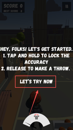 1、熟悉核心操控:掌握点击屏幕控制篮球、调整手指力度的基础操作,明确“精准投篮入网、争取高分获胜”的核心目标。