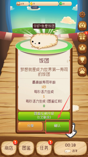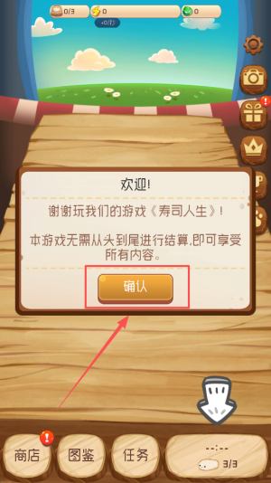 1、进入游戏:屏幕显示“欢迎!谢谢玩我们的游戏《寿司人生》!确认”,点击“确认”,立刻进入主界面。