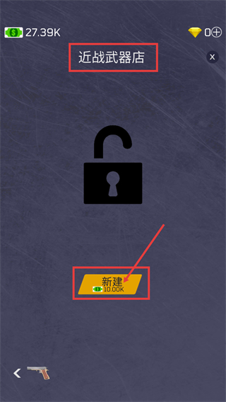 2、进入【近战武器店】界面,消耗【10.00K】-货币点击【新建】,解锁该店铺以拓展经营品类与收益渠道。