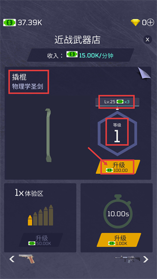 3、【近战武器店】建成后初始收入为【15.00K/分钟】,可消耗资源升级【撬棍】-至更高等级,提升店铺的收益效率。