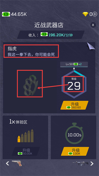 4、升级【近战武器店】后,武器更新为【指虎】,等级升至【29】,收入提升至【196.20K/分钟】,强化店铺收益能力。