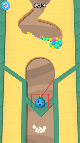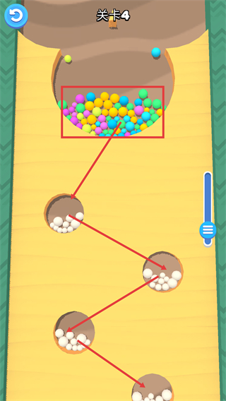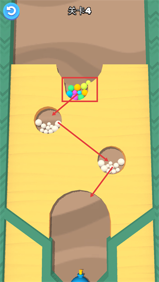 1、在【关卡4】中,滑动挖开沙土,让顶部的彩色球顺着路径经过白球区域,逐步推进当前关卡的流程进度。