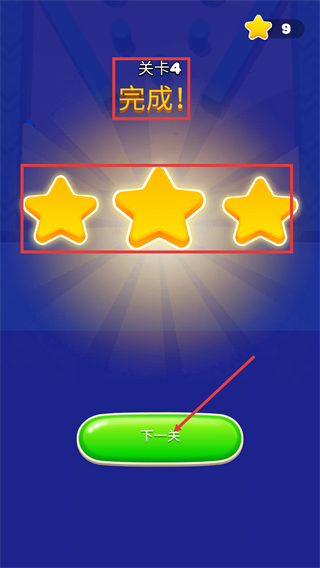 4、【关卡4】完成后获得三星评价,界面显示【完成!】,点击【下一关】按钮进入后续关卡挑战。