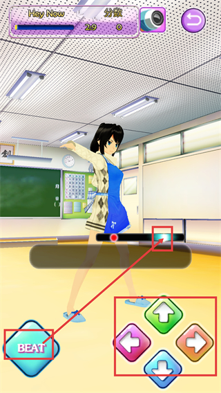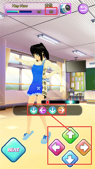 2、进入后可见【Play-Now】标识与分数-20,当对应指令出现时,点击被标注的【BEAT】按钮,同时配合方向键完成操作来推进。