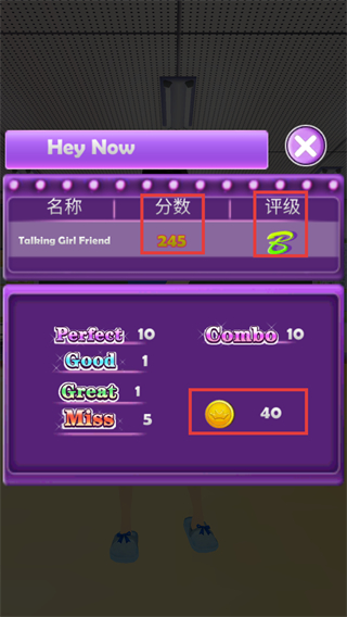 4、游玩结束后进入结算界面,可见【Hey-Now】标识,查看名称-分数-评级,同时可看到【Perfect-10】等评价项,还能获得金币-40。