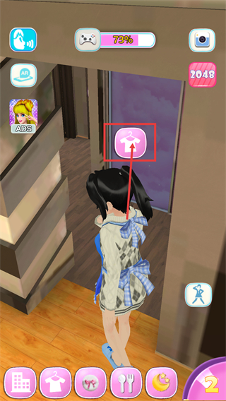1、看到界面内的【AR】【ADS】【2048】标识,当前进度为73%,点击被标注的【衣服图标】,即可进入角色装扮的功能模块。