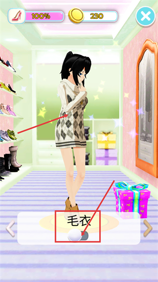 2、进入后进度显示为100%,当前金币数量是230,选择被标注的【毛衣】选项,可完成对应服饰的装扮并触发特效。